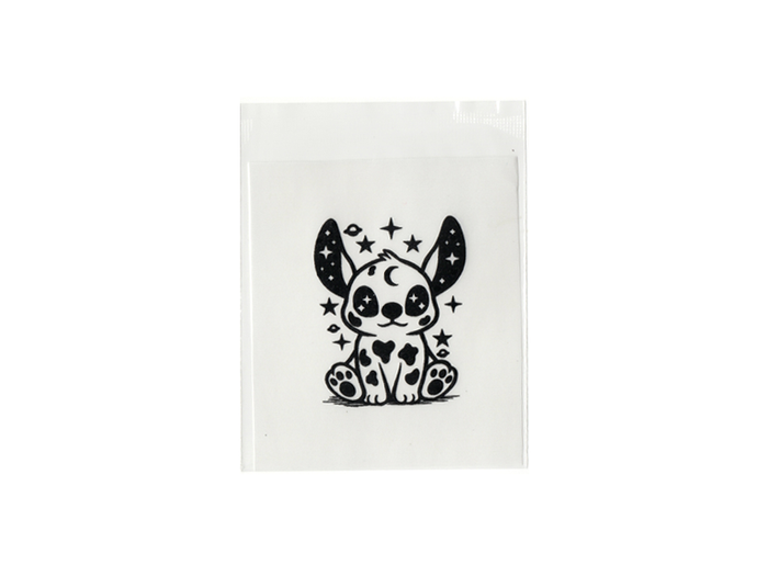 Jest to idealny tatuaż dla dzieci. Szablony firmy Lunar Tattoo same w sobie stanowią tatuaż. Składają się z dwóch części - papieru podkładowego oraz przeźroczystej folii, na której naniesiony jest wzór w postaci kleju do tatuaży. Całość została zapakowana w woreczek, który trzeba rozciąć przed wykonywaniem tatuaży. Chroni on produkt przed kurzem, wilgocią oraz wszelkimi innymi zanieczyszczeniami. Do wykonania tatuażu brokatowego potrzebujesz jeszcze tylko pudru brokatowego.