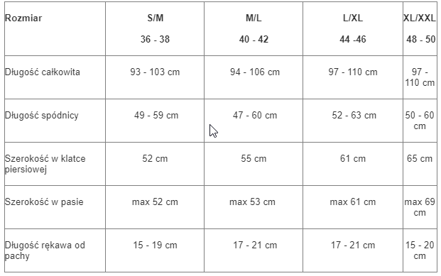 Dzień dobry Państwu, rozmiar - M Szerokość ramion: ok. 50cmSzerokość pod pachami: ok. 55cmDługość rękawa: ok. 22cm (od wew.)Szerokość w pasie: ok. 54cmDługość sukienki: ok. 115cm rozmiar - L Szerokość ramion: ok. 50cmSzerokość pod pachami: ok. 57cmDługość rękawa: ok. 24cm (od wew.)Szerokość w pasie: ok. 58cmDługość sukienki: ok. 117cm rozmiar - XL Szerokość ramion: ok. 50cmSzerokość pod pachami: ok. 60cmDługość rękawa: ok. 24cm (od wew.)Szerokość w pasie: ok. 65cmDługość sukienki: ok. 120cm Pozdrawiamy!