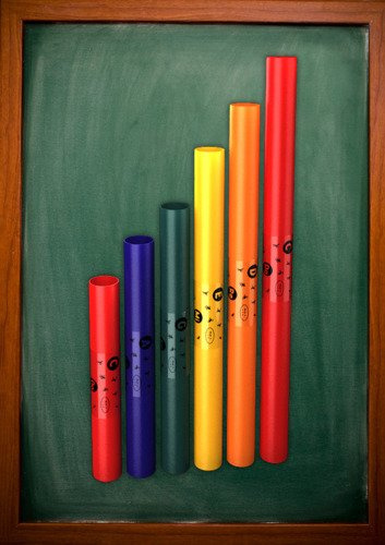 6 rurek (C’, D’, E’, G’, A’, C’’) w kolorach systemu Chroma-Notes o długościach od 30 do 62 cm.