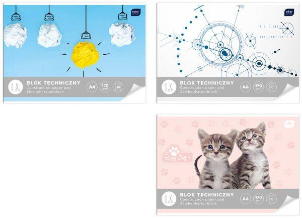 - Blok techniczny biały A4 . Kolorowe okładki przyciągające uwagę dzieci. Cena za sztukę. Zeszyt: 10 kartek