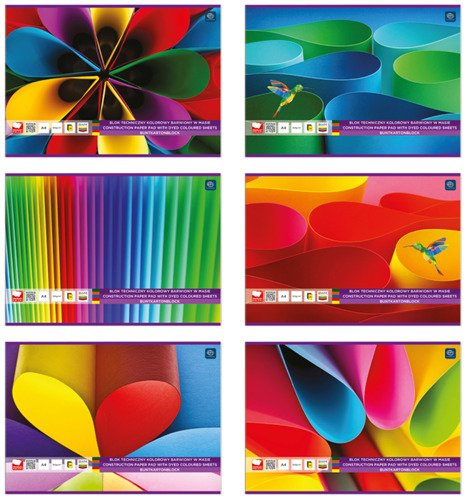 - Blok techniczny kolorowy A4 . Kolorowe okładki przyciągające uwagę dzieci. Cena za sztukę. Zeszyt: 20 kartek Barwiony w masie dzięki czemu kolory są żywsze a po roztarganiu nie ma białych strzępów.