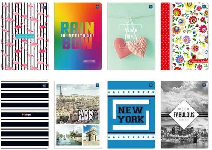 Zeszyty w intensywnych kolorystycznie grafikach, stworzone zgodnie z aktualnymi trendami tak,