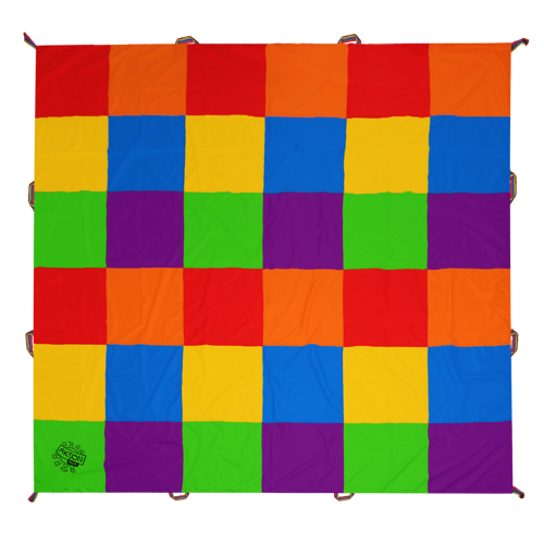 Mata obszyta jest tęczową taśmą wzmacniającą, wyposażona jest w 12 wzmacnianych uchwytów, które poszerzają wachlarz animacji i zabaw, możemy matę rozłożyć na ziemi bądź trzymać w powietrzu, jak również dzięki uchwytom łatwo przymocujemy matę do podłoża.