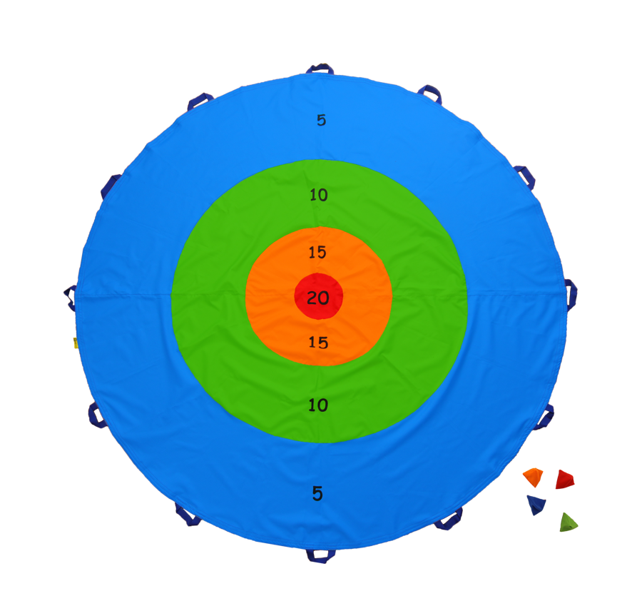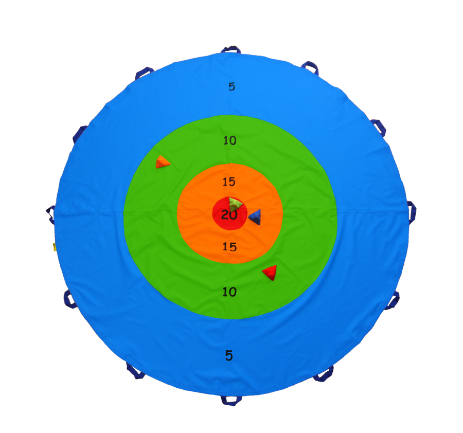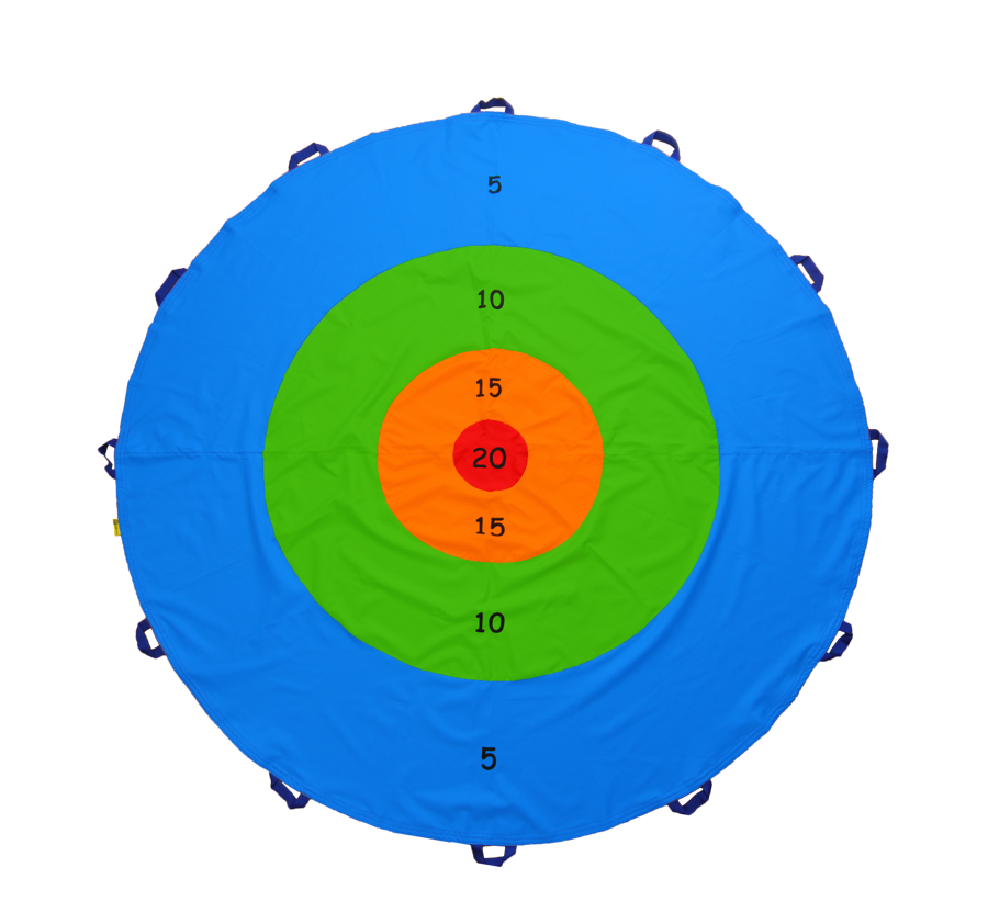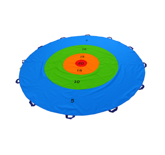 • Chusta Tarcza to cztery barwne okręgi, każdy okrąg to inny kolor i inna punktacja (niebieski 5, zielony 10, pomarańczowy 15, czerwony 20).