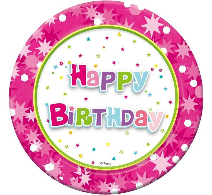 Talerzyki papierowe Happy Bithday różowe okrągłe 18cm 6 szt