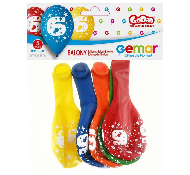 - Balony gumowe o klasycznym kształcie firmy GEMAR z nadrukiem cyfra 6 Rozmiar 12 cali.