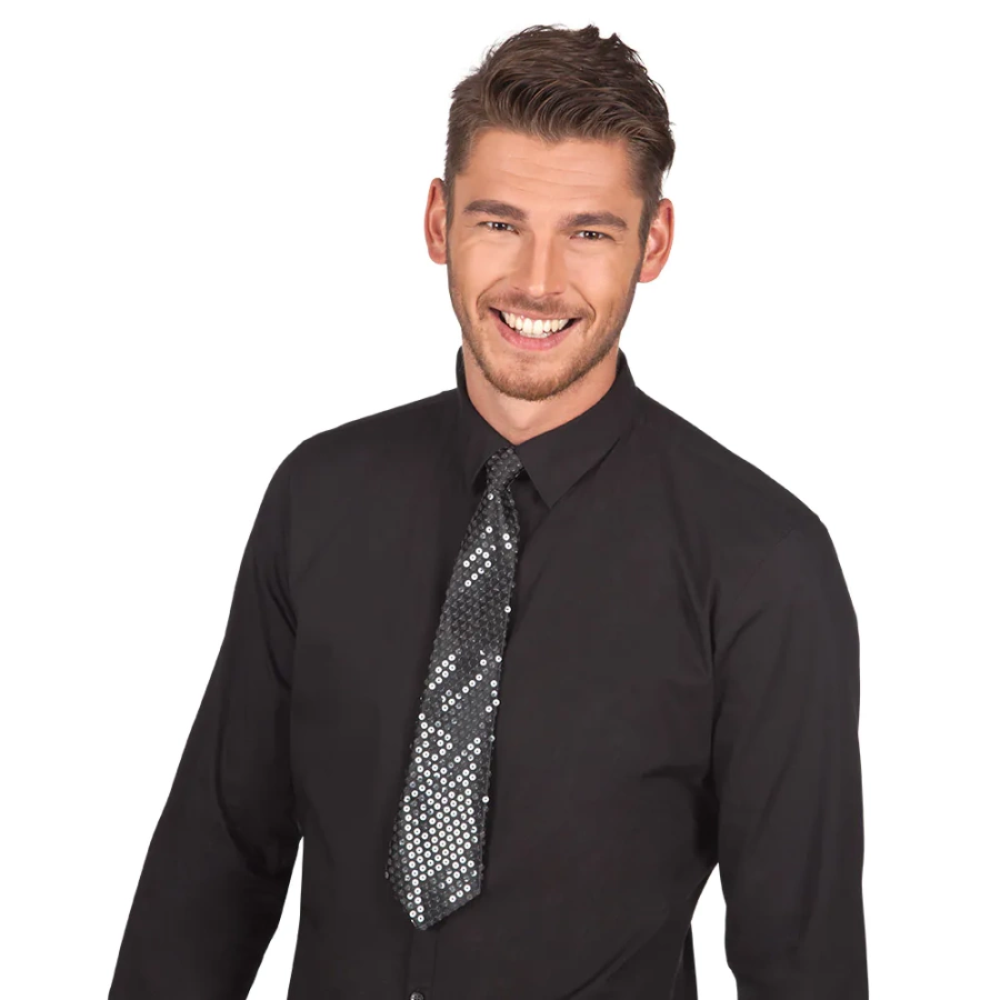 Krawat wykonany jest z wysokiej jakości materiałów, na całej długości został pokryty pięknie lśniącymi cekinami, dzięki którym osoba nosząca go na pewno zabłyśnie w każdym towarzystwie.
