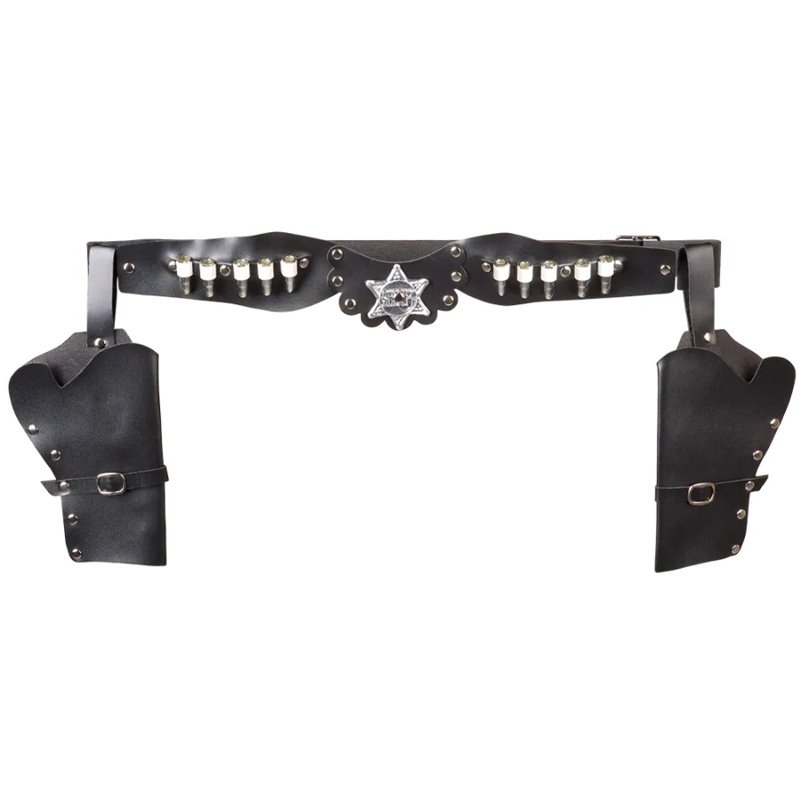 Rekwizyt w kolorze brązowym ozdobiony srebrnymi ćwiekami oraz gwiazdą Szeryfa, kowbojski styl podkreśla również 12 przypiętych do pasa sztucznych naboi.