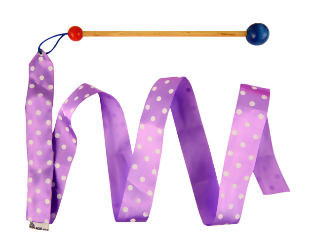 Materiał połączony jest z drewnianą tyczką kolorowym sznureczkiem, a tyczka zakończona jest po obu stronach drewnianymi kulkami, dzięki czemu wstążka idealnie pasuje do małych rączek i jest wygodna w użytkowaniu.
