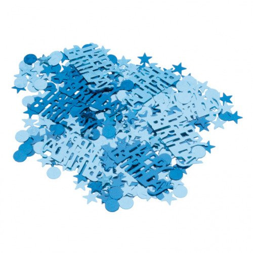 - Konfetti foliowe bogate w przepiękne niebieskie kształty: kółka, gwiazdki oraz napisy Happy Birthday (15 g).