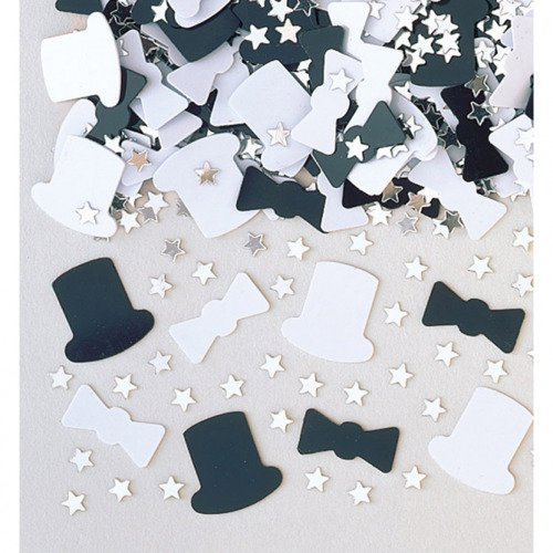 - Konfetti foliowe bogate w przepiękne metaliczne kształty: kapelusze, muchy oraz gwiazdki (14 g).