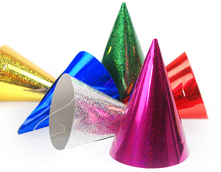 - Papierowa czapeczka w kształcie stożka, mocowana na elastycznej gumce. Czapeczkę zdobią holograficzne kropeczki. Cena za sztukę.