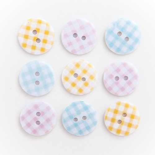 Guziki samoprzylepne w piękną kratę o pastelowych kolorach, to prosty i wygodny sposób na zdobienia.