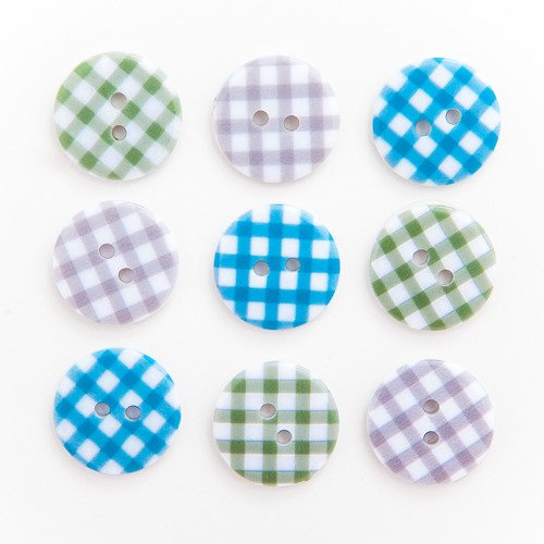 Guziki samoprzylepne w piękną kratę o pastelowych kolorach, to prosty i wygodny sposób na zdobienia.