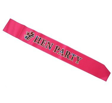 - Szarfa wykonana z gładkiej różowej tkaniny przypominającej satynę, z napisem HEN PARTY.