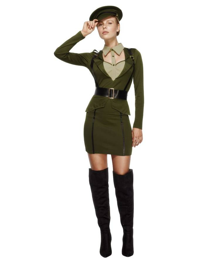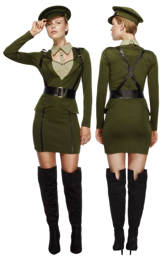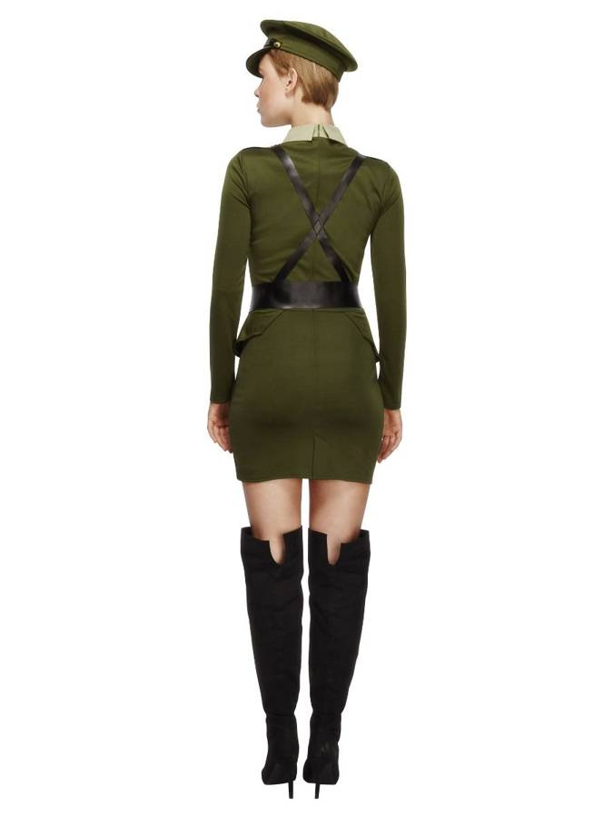 - Sukienka z kołnierzykiem, z nierozciągliwego materiału, zapinana z tyłu na zamek, daszek czapki jest usztywniony a pasek wykonany ze skóropodobnego materiału zdobiony metalowymi sprzączkami i szelkami.