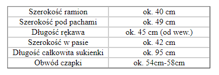 Podane poniżej wymiary kostiumu, są to wymiary rzeczywiste stroju, mierzonego na płasko (bez rozciągania materiału).