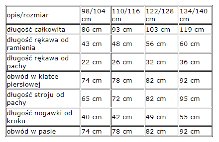 | opis/rozmiar | 98/104 cm | 110/116 cm | 122/128 cm | 134/140 cm |