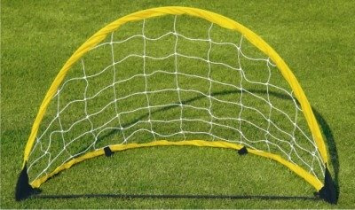 Przenośna bramka do piłki nożnej wykonana z siatki.