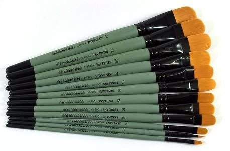 Pędzle sztuczne z włosia Czerwony Toray. Pędzel koci język, półokrągło wykończony, więc łączy w sobie cechy pędzla okrągłego i płaskiego.