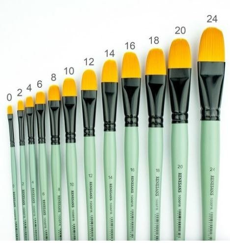 Pędzle sztuczne z włosia Czerwony Toray. Pędzel koci język, półokrągło wykończony, więc łączy w sobie cechy pędzla okrągłego i płaskiego.
