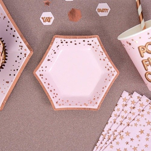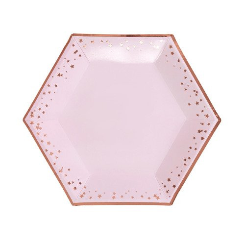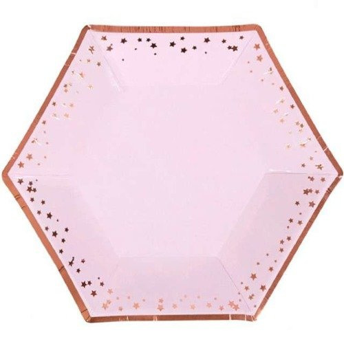 Talerzyki papierowe Różowe w złote gwiazdki sześciokąt rozm.M 8 szt