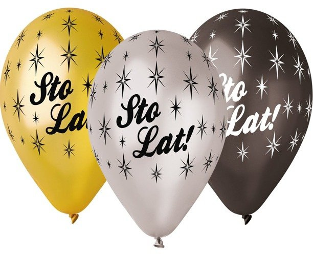 - Balony gumowe o klasycznym kształcie firmy GEMAR z eleganckim nadrukiem STO LAT. Rozmiar 13 cali. Opakowanie 6 sztuk, mix kolorów: złoty, srebrny, czarny.