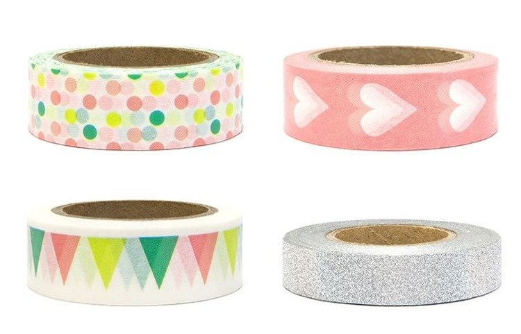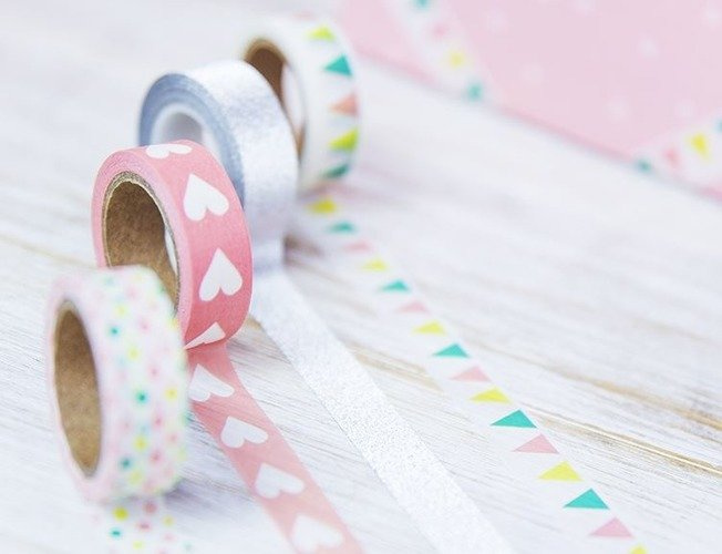 - Taśma dekoracyjna papierowa, samoprzylepna (Washi Tape) w kolorze srebrnym brokatowym, rumianoróżowym i białym.