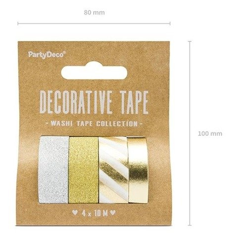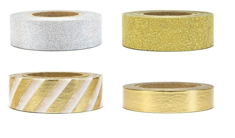 - Taśma dekoracyjna papierowa, samoprzylepna (Washi Tape) w kolorze kolorze srebrnym brokatowym, złotym brokatowym i złotym metalizowanym.
