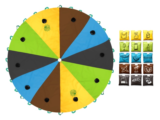 • Zestaw Chusta Edukacyjna Recykling AKSON 3m + 15 woreczków. Średnica 3m wzmacniana taśmą i 30 uchwytami, woreczki gimnastyczne w pięciu kolorach z nadrukiem - odpady do segregowania, kolorowy pokrowiec z uchwytem