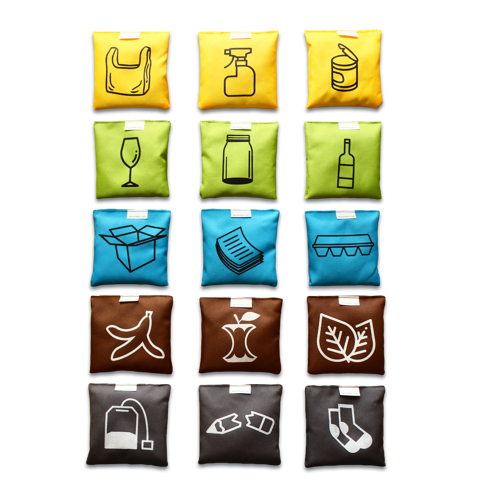 Dodatkowe elementy to zestaw woreczków z nadrukiem konkretnych odpadów w kolorach adekwatnych do kolorów  na chuście, dzięki czemu nauka segregowania odpadów jest łatwa i przyjemna.