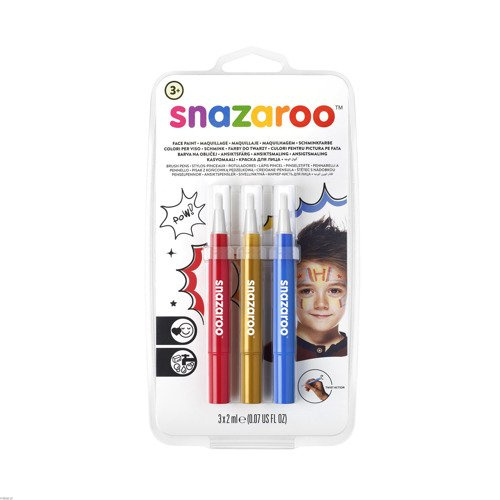 - Zestaw 3 nietoksycznych pisaków Snazaroo do malowania twarzy i ciała. Farba umieszczona w pędzelku sprawia, że malowanie jest szybkie i łatwe, bez konieczności używania osobnych pędzli, czy wody. Doskonałe zarówno dla dzieci jak i dorosłych.