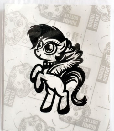 4. Ściągnij powoli przezroczystą folię uważając czy żaden element nie odchodzi z folią przezroczystą (jeśli tak to cofnij się i ponownie dociśnij szablon) a następnie wypełnij go pyłkiem brokatowym lub pudrem transparentnym za pomocą pędzelka.