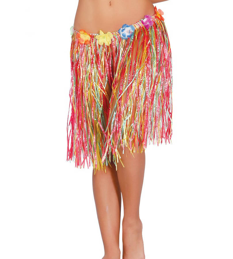 - Spódnica hawajska z kwiatkami o długości ok. 55 cm. Spódnica z gumką w pasie ozdobioną licznymi kolorowymi kwiatkami.