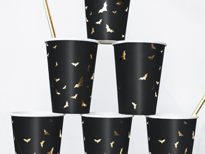 Kubeczki czarne w złote nietoperze halloween papierowe 220ml 6 szt