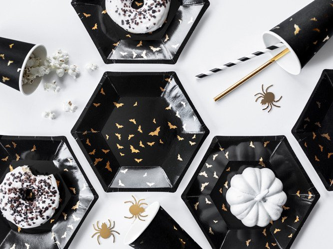 - Talerzyki papierowe w kolorze czarnym z nadrukiem złotych nietoperzy