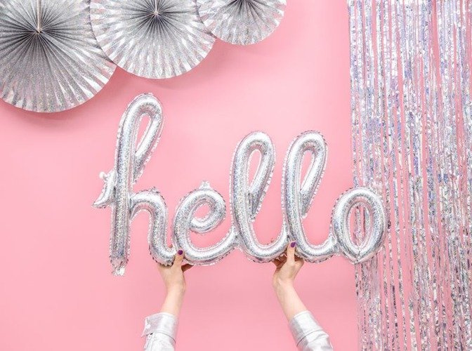Uroczny, holograficzny balon foliowy z napisem HELLO.