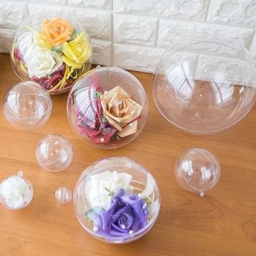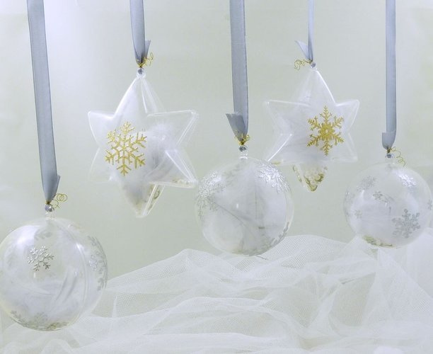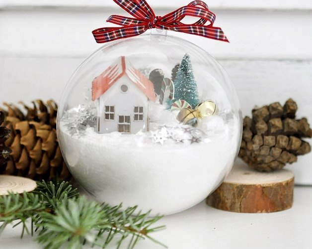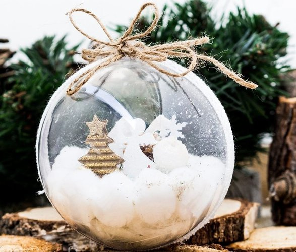 Śliczna bombka dekoracyjna wykonana jest ze przezroczystego plastiku dzięki czemu można ją wypełnić i udekorować od środka.