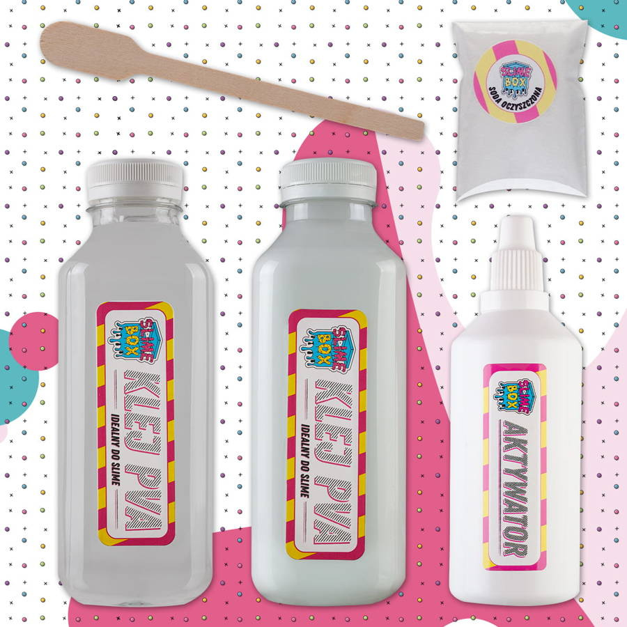 Zestaw aktywator (100 ml płynu do soczewek i soda oczyszczona w osobnej saszetce, pamiętaj aby dodać oba produkty do kleju PVA).