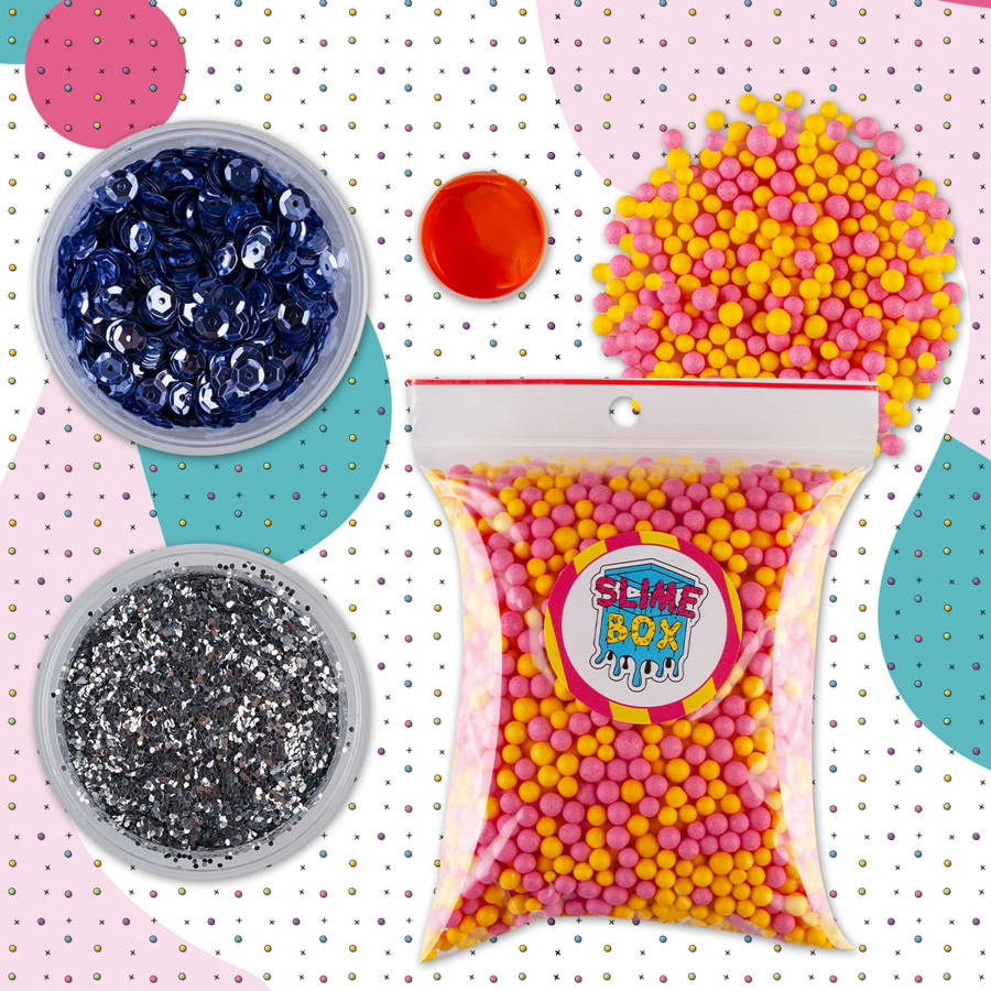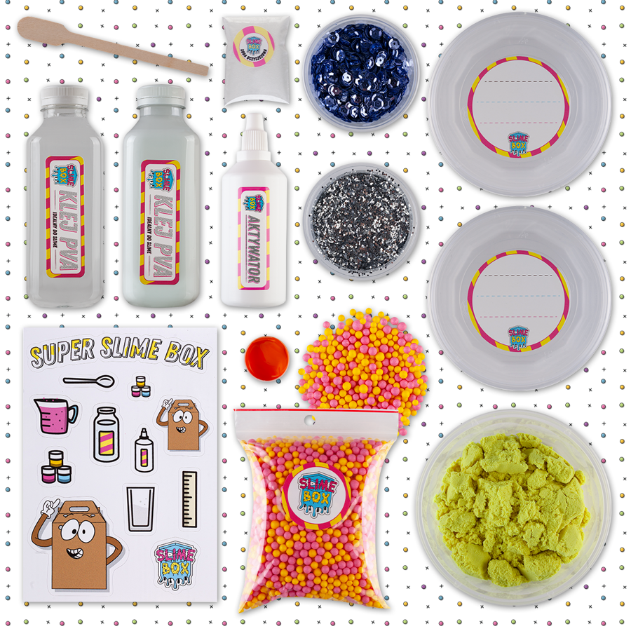 W zestawie znajdują się wszystkie niezbędne produkty do samodzielnego przygotowania pięciu slime. Do każdego Super Slime Boxa dołączamy dodatki, które są niespodzianką, ale umożliwiają za każdym razem zabawę w nowe kolory, formy czy struktury utworzonej masy.