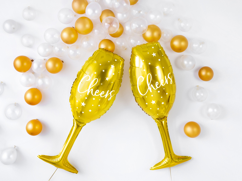 Balon foliowy metalizowany Kieliszek w kolorze złotym z białym napisem ""Cheers"", wymiary ok. 28 x 80 cm (11 x 31,5")