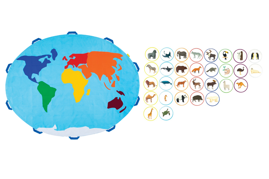 Nasza chusta edukacyjna mapa świata to wyjątkowe narzędzie, łączące edukację z zabawą. Chusta w kształcie elipsy, obszyta jest wytrzymałą taśmą nośną i posiada 10 wzmacnianych uchwytów, które rozszerzają możliwości animacji i zabaw. Może być używana jako mata rozłożona ziemi, jak i typowa chusta animacyjna. Dzięki uchwytom łatwo trzymać chustę w dłoniach lub przymocować matę do podłoża, a dodatkowe wzmocnienie materiałem zwiększa jej trwałość.