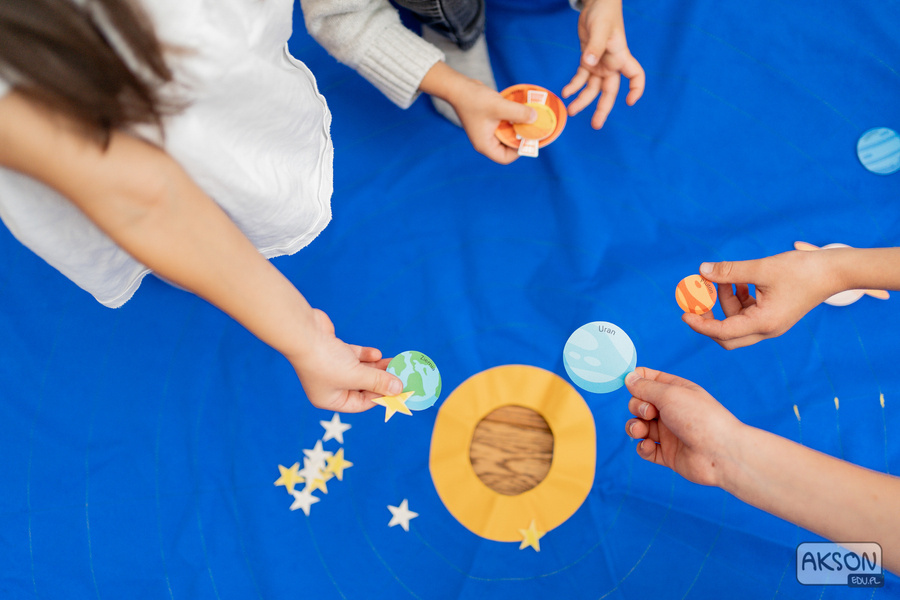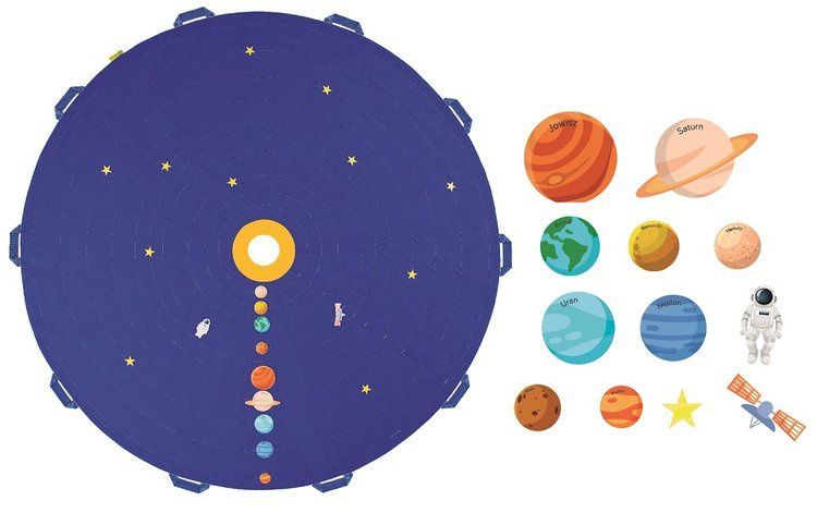 - Zestaw Chusta edukacyjna Układ Słoneczny Akson + 21 dodatków edukacyjnych. Średnica 140 cm wzmacniana taśmą i 12 uchwytami, dodatki na rzep: 10 szt gwiazd, planety x 9, astronauta x 1, satelita x 1, praktyczny, kolorowy pokrowiec z uchwytem