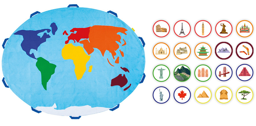Dodatkowe elementy, takie jak zestaw edukacyjne do chusty zabytki wykonane są z trwałego tworzywa z rzepem. To interaktywne dodatki, które umożliwiają dowolne przypinanie i odpinanie w różnych miejscach, dostosowując się do indywidualnych potrzeb edukacyjnych. Elementy obramowania na dodatkach edukacyjnych posiadają barwy zgodne z kolorami odpowiadającymi poszczególnym kontynentom, co sprawia, że proces nauki przez zabawę staje się jeszcze bardziej przyjemny!