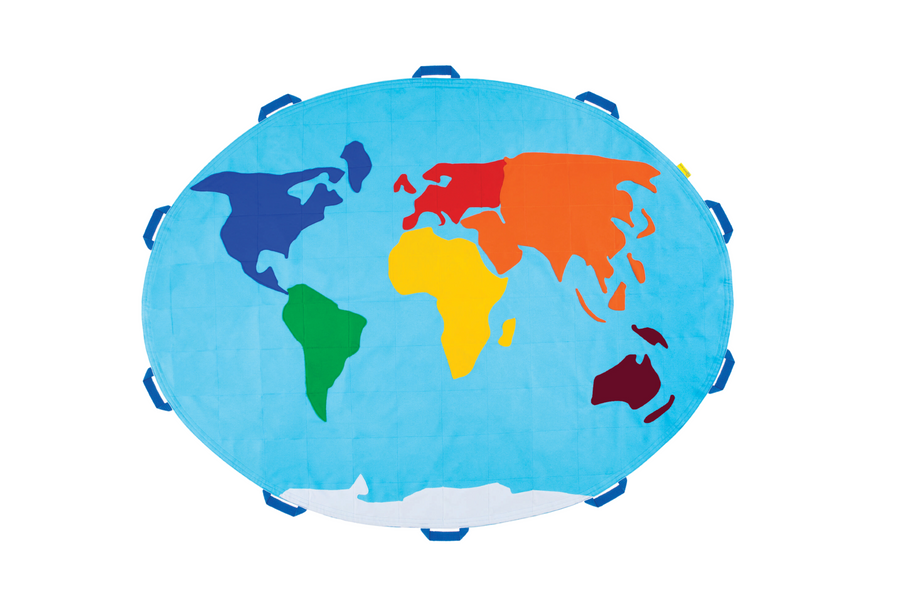 Nasza chusta edukacyjna mapa świata to wyjątkowe narzędzie, łączące edukację z zabawą. Chusta w kształcie elipsy, obszyta jest wytrzymałą taśmą nośną i posiada 10 wzmacnianych uchwytów, które rozszerzają możliwości animacji i zabaw. Może być używana jako mata rozłożona ziemi, jak i typowa chusta animacyjna. Dzięki uchwytom łatwo trzymać chustę w dłoniach lub przymocować matę do podłoża, a dodatkowe wzmocnienie materiałem zwiększa jej trwałość.