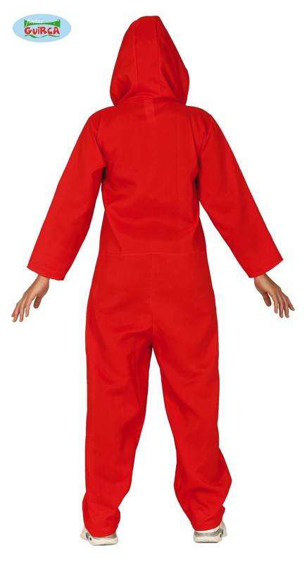 Czerwony, jednoczęściowy kombinezon wraz z kapturem.