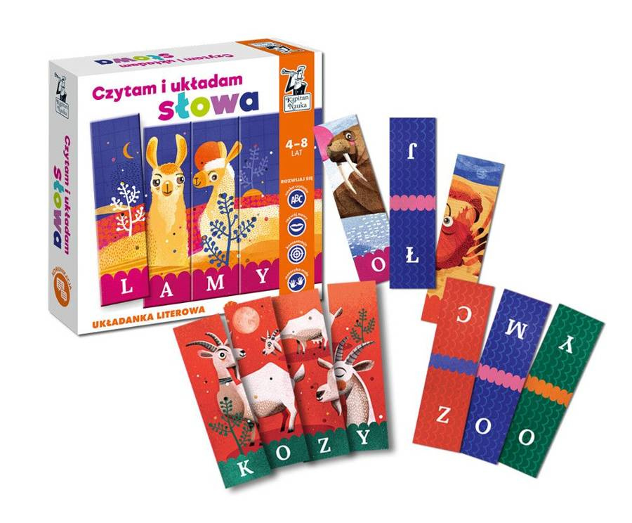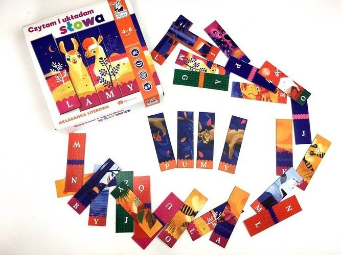 Układanka „Czytam i układam słowa” polega na układaniu prostych wyrazów: nazw znanych dziecku zwierząt. W skład pakietu wchodzi 60 dwustronnych kafelków, z których można ułożyć 8 trzyliterowych i 9 czteroliterowych nazw. Na odwrocie znajdują się pojedyncze litery, z których można układać własne słowa.