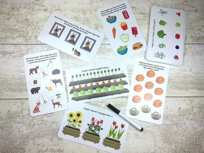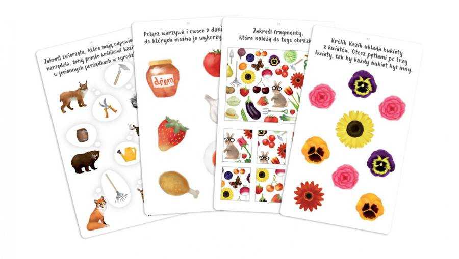 Na 30 dwustronnych, zmywalnych kartach znajdują się zagadki i łamigłówki o różnym stopniu trudności opracowane przez pedagogów i nauczycieli pracujących z przedszkolakami i uczniami. Atrakcyjna tematyka została świetnie zilustrowana przez Dankę Fukowską. Dzięki jej niepowtarzalnej kresce przedszkolaki odkrywają z królikiem Kazikiem piękno ogrodu o każdej porze roku. Dołączony do zestawu flamaster suchościeralny pozwala wielokrotnie rozwiązywać zadania.