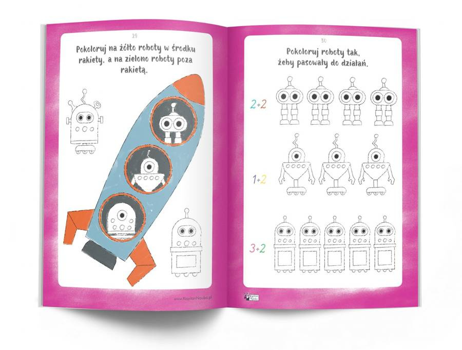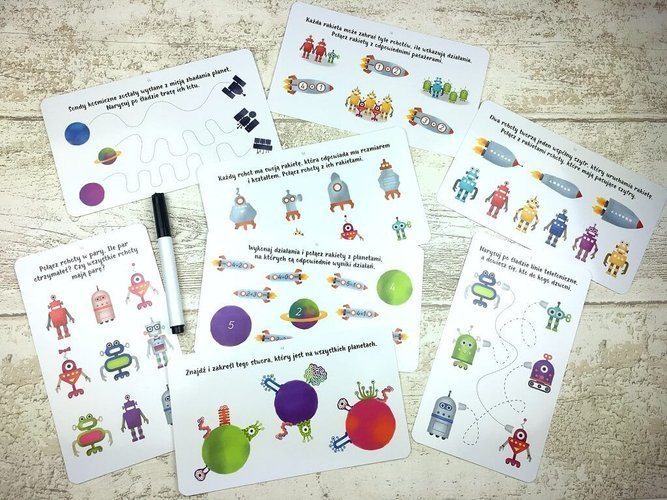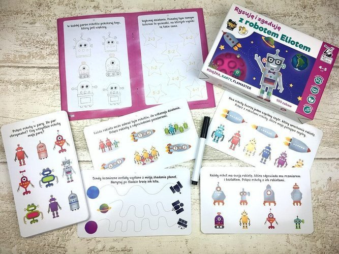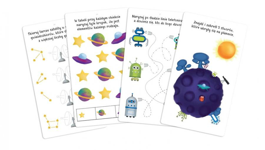 - 100 kosmicznych zagadek dla najmłodszych! Zestaw zabaw edukacyjnych dla dzieci w wieku 4-5 lat, który rozwinie umiejętności i zainteresowania dziecka, przenosząc go do kosmicznego świata pełnego robotów, planet i różnorodnych zadań.