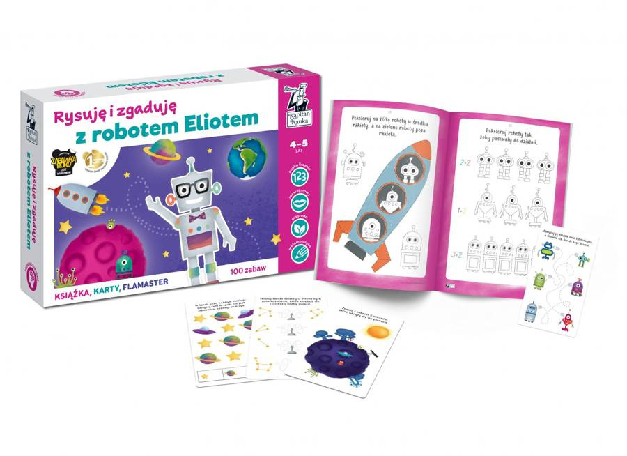 RYSUJĘ I ZGADUJĘ Z ROBOTEM ELIOTEM KSIĄŻKA KARTY KAPITAN NAUKA